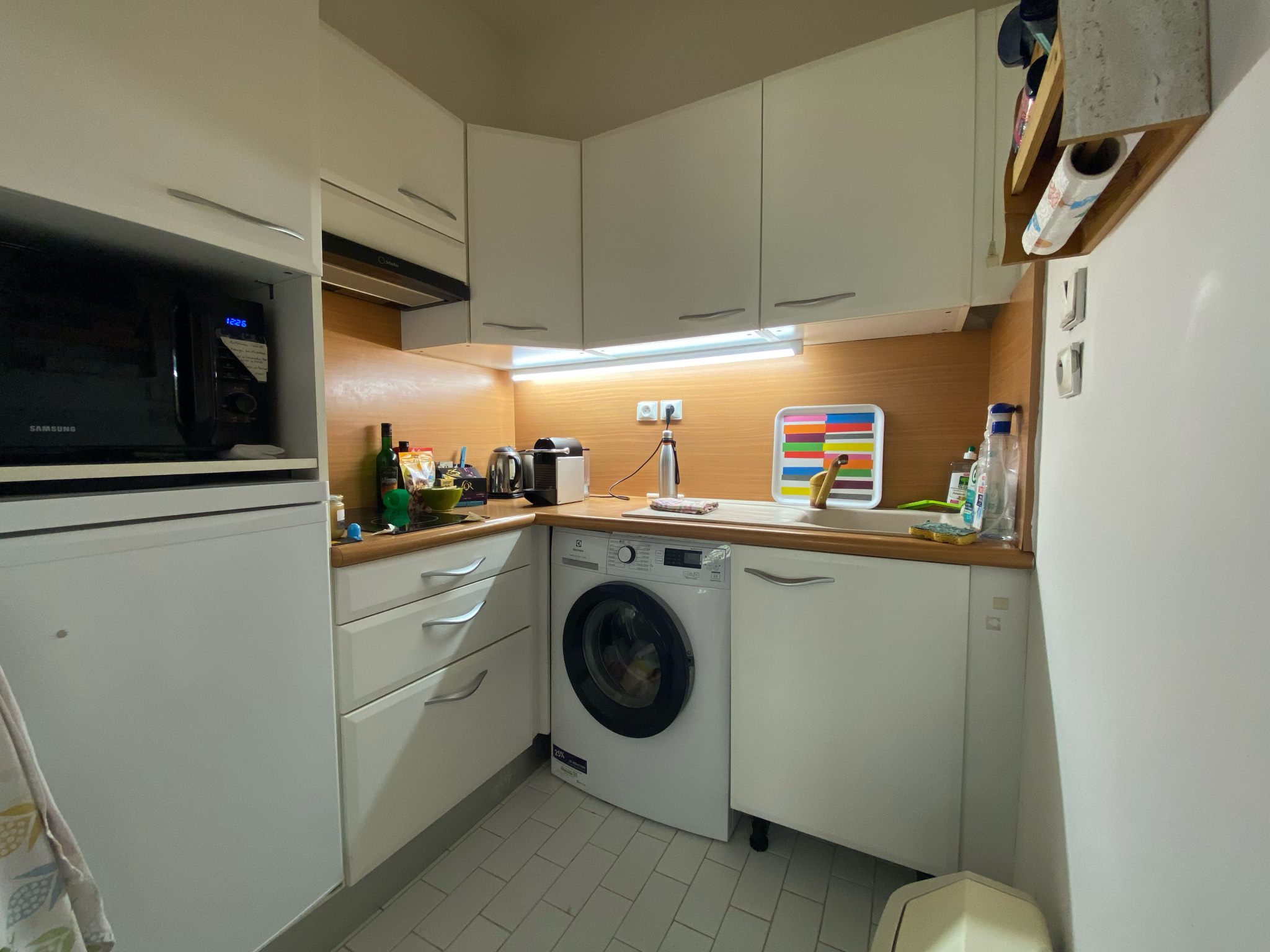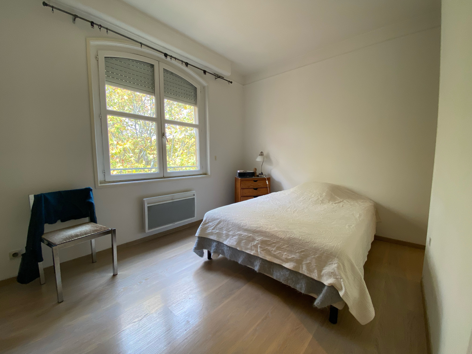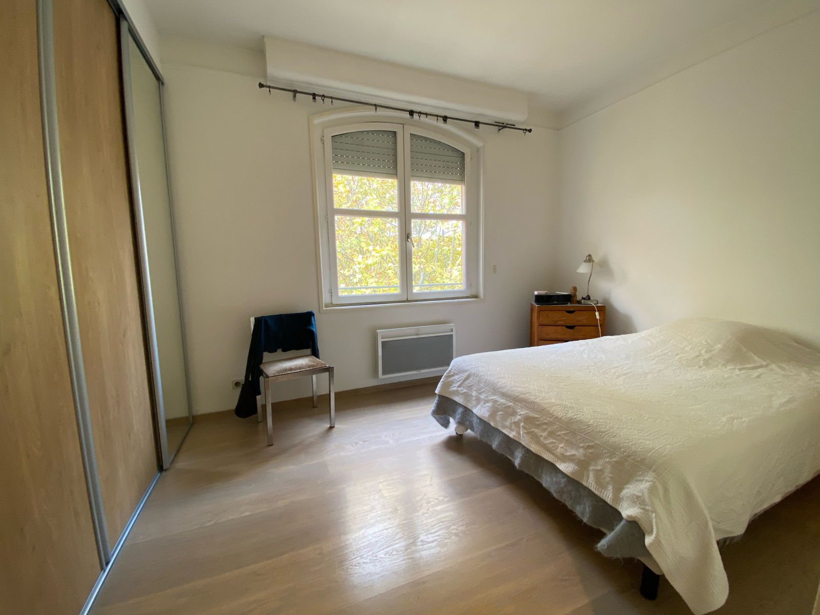 Cet appartement est situé au 4ème étage avec vue d'angle sur la rue, il est composé d'une entrée avec placards, d'un wc séparé,, d'un salon et d'une chambre avec deux grands placards, d'une cuisine récente équipée (frigo, micro onde, plaques,hotte et lave linge), d'une salle de bain (chauffe serviettes, douche, meuble vasque) attenante à la chambre. Une cave complète ce bien. Parquet.
